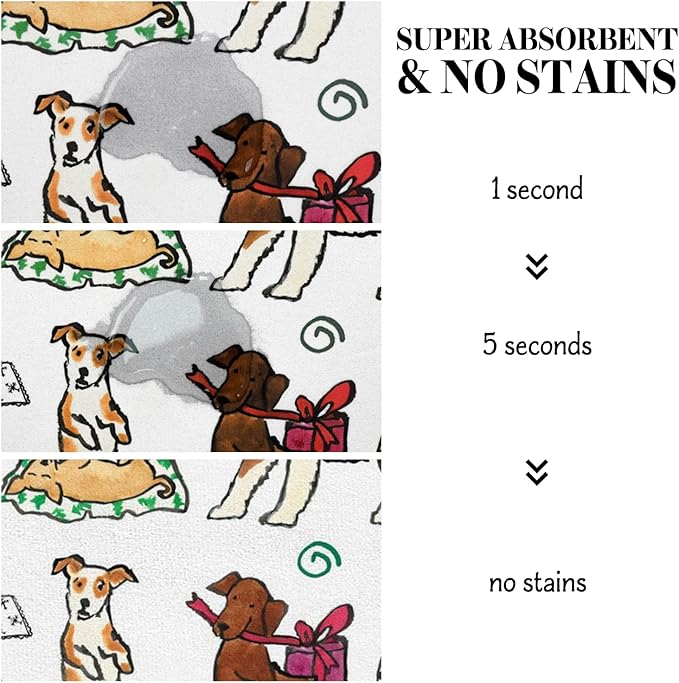 - Super Absorption: The christmas dog mat for water bowl can absorb spilled water without leaving traces and dry quick, avoid wetting pet paws even for messy drinkers. And it does not attract pet hair like traditional silicone dog bowl mat.