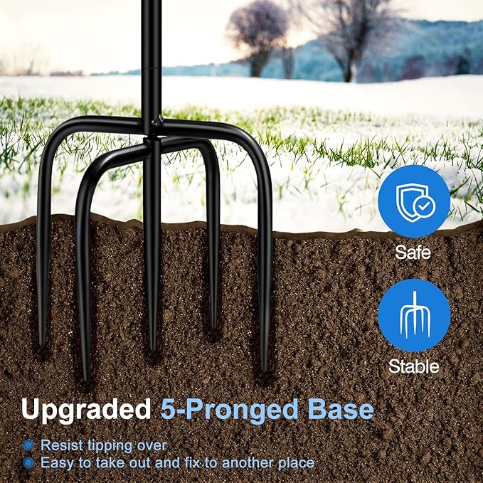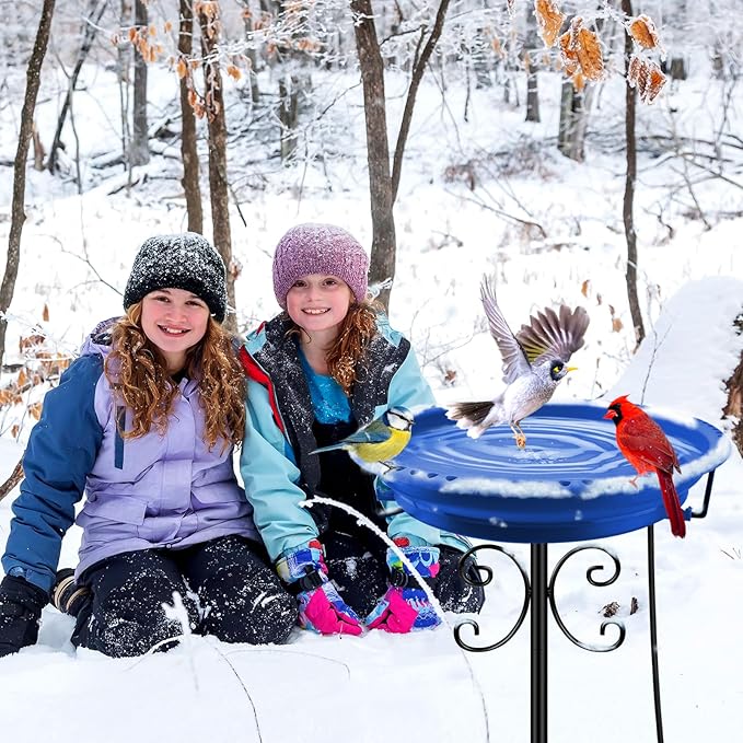 - 【Sturdy Metal 5-Pronged Base】Upgraded 5-forked base that resists tipping, adds more stability for this birdbath, make sure this heated bird bath stay in the soil of your garden upright and firmly; Heavy duty metal stake with black powder coat finish offers strong support for this bird bath, so that it is hard to bend, break or fracture