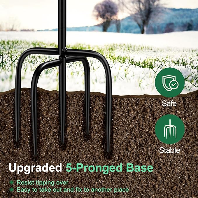 - 【Sturdy Metal 5-Pronged Base】Upgraded 5-forked base that resists tipping, adds more stability for this birdbath, make sure this heated bird bath stay in the soil of your garden upright and firmly; Heavy duty metal stake with black powder coat finish offers strong support for this bird bath, so that it is hard to bend, break or fracture
