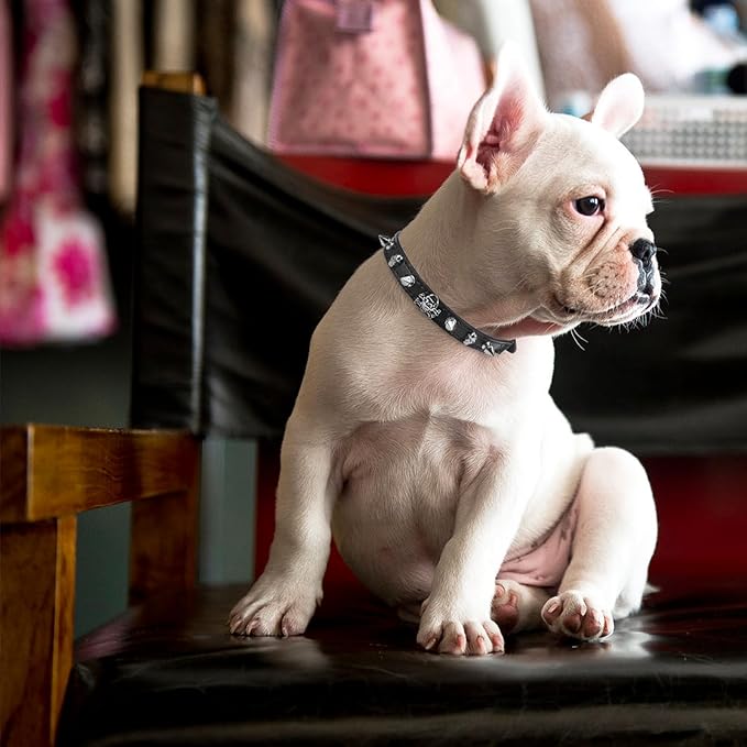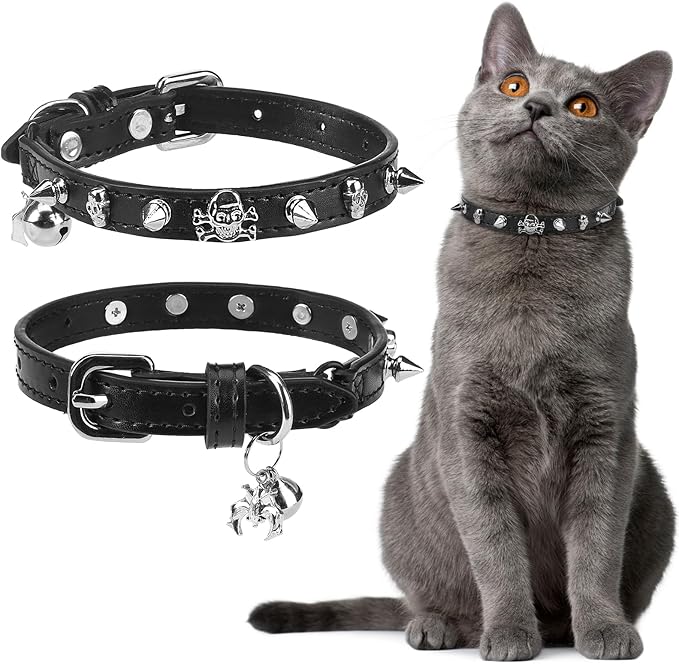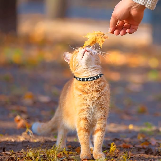 - PERSONALIZED CAT COLLAR: The pet collar features a studded design, perfect for adding atmosphere to your pet. It also includes bells and small charms to add charm to your pet. The spikes are polished and won't be too sharp, so you don't have to worry about hurting your pet's skin or fur.