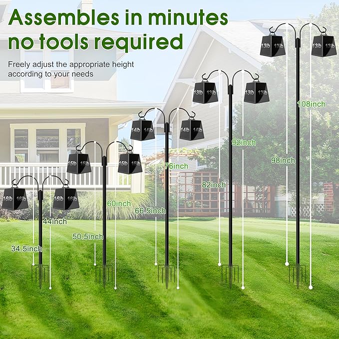 - Versatile and Multipurpose: With its sturdy structure and double-arm design, our outdoor shepherd hook is perfect for hanging solar lights, flower baskets, flower pots, hummingbird feeders, wind chimes, etc., which can be perfectly combined with various outdoor environments.