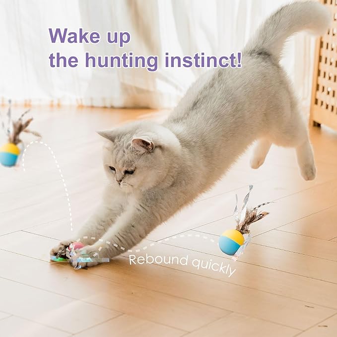 - CAT ATTRACTING DESIGN - Toss it against any hard surface, and check this out. It's like a moving prey bouncing around with those colorful feathers all decked out, just like a real escape scene! Whoa, the prey's on the run! Time to kick off some serious hunting action! Meow! Look alive! Lock in! Go for the hunt! Play all day long and never get tired of it!