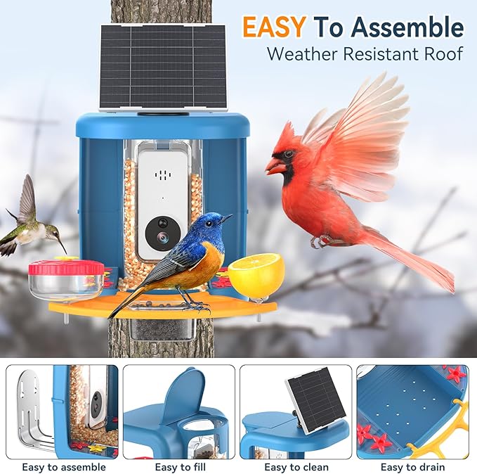 Solar-Powered Smart Bird Feeder with Camera Solar Powered,2K Video Recording, Auto Bird ID & Extensive DIY Accessories,2 in 1 Hummingbird Feeder Camera Ideal Present for Bird Lovers (Blue)