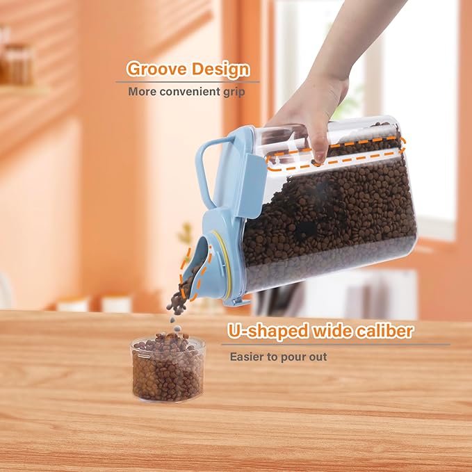 - 1.MULTI FUNCTION PET FOOD STORAGE: Keeps your pet food fresh and protected from water vapor in this airtight cat food bin.Completing with pour spout design,this cat biscuit bin will enhance your space and make every pouring fast and neat.There's even a measuring cup making it easier for feeding times as well.