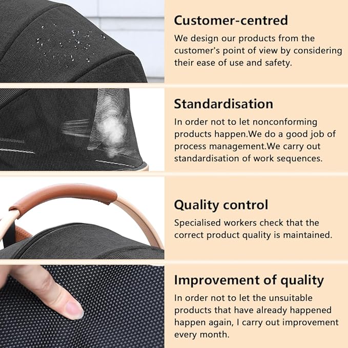 - SAFETY AND RELIABILITY: The four wheels are made of durable PU material to suit all occasions. The pushchair has large wheels and the front wheels can swivel 360Β°, these wheels not only ensure durability but also provide smooth and quiet operation. Whether you are walking on the sidewalk or on rough ground, our pet stroller will provide a comfortable and pleasant experience for your pet.