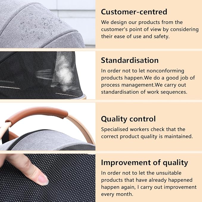 - SAFETY AND RELIABILITY: The four wheels are made of durable PU material to suit all occasions. The pushchair has large wheels and the front wheels can swivel 360Β°, these wheels not only ensure durability but also provide smooth and quiet operation. Whether you are walking on the sidewalk or on rough ground, our pet stroller will provide a comfortable and pleasant experience for your pet.
