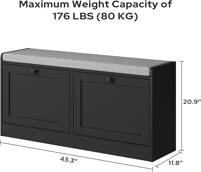 - Durable and Comfortable: Crafted from high-quality wood, our entryway storage bench can support up to 176 lbs while providing a comfy cushioned seat for putting on your shoes. Enjoy lasting durability and comfort all in one chic package.