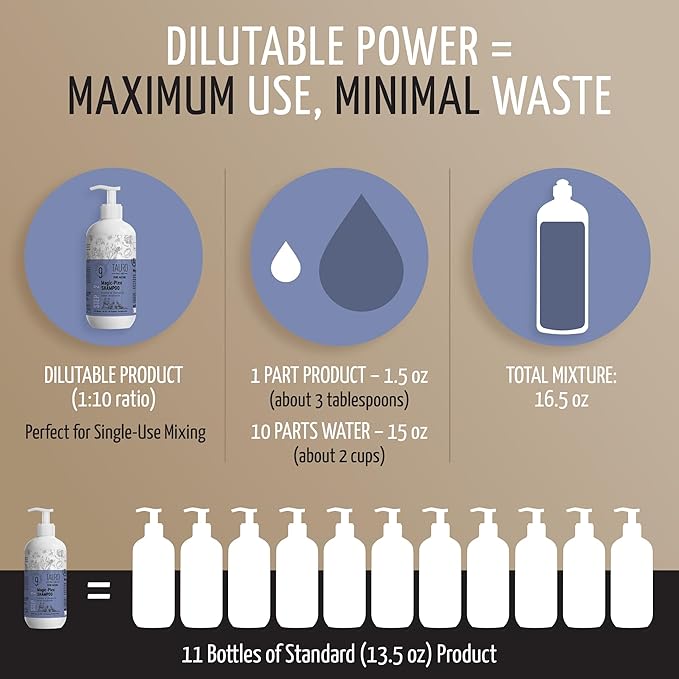 - Smart Choice for Pet Supplies: Comes in a 13.5 fl oz bottle; dilutable 1:10 makes 11 bottles of shampoo; made in the EU that integrates seamlessly into your routine of puppy essentials, dog stuff, or cat products; a go-to item for pet owners looking to simplify coat maintenance with a premium, natural product that supports a healthy, vibrant appearance