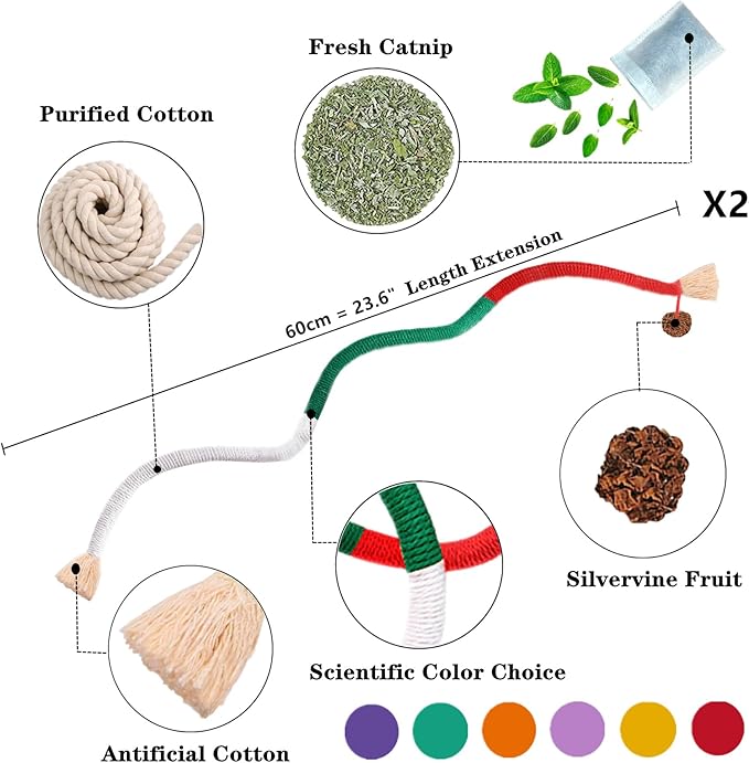 - Mixed Cat Rope Cat Stick Cat Grass: Mixed Cat toys for meet all indoor kitten needs included: 1 x catnip bag + 2 x 23.6” cat catnip rope toys + 4*cat silvervine with lafite grass or feather +6* Cat grass sticks. Cat toys for indoor cats is suitable for cats of all ages & breeds, relaxation for every stage of life. No wire inside, safe to use.