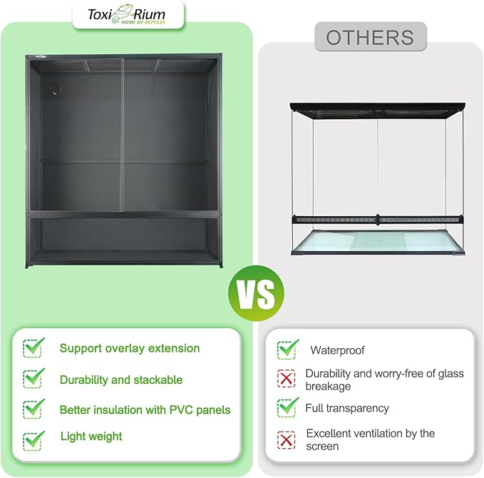 - 【Toxirium Reptile Tank thrives for various reptiles】: with a good function on heat and humidity maintenance, an extra large and tall space for reptile habitat creation, and easy access to watch and interact with reptiles, this reptile enclosure is an ideal choice for professional herpetologists and reptile pet lovers. Toxirium designed this enclosure specially for desert-dwelling reptiles like bearded dragons, ball pythons, leopard geckos, desert lizards