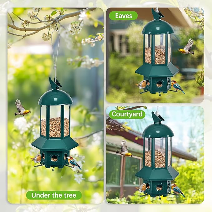 - Six Feeding Openings:Six well-spaced feeding openings with perches allow multiple birds to feed at the same time, Ideal for mixing seed.Equipped with a convenient hook, this feeder can be easily hung in various outdoor locations, such as trees, fences, or balconies, providing birds with a safe and accessible feeding spot.Product Size (19.7cm*19.4cm*36cm)