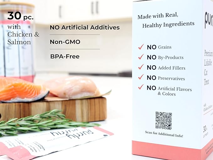 Purrly Hydrating Wet Cat Treat Snack Topper Creamy Purée Human-Grade Chicken Breast & Salmon with Omega-3 & 6 for Skin & Coat (30 Count) Healthy Lickable Squeeze Soft Snack