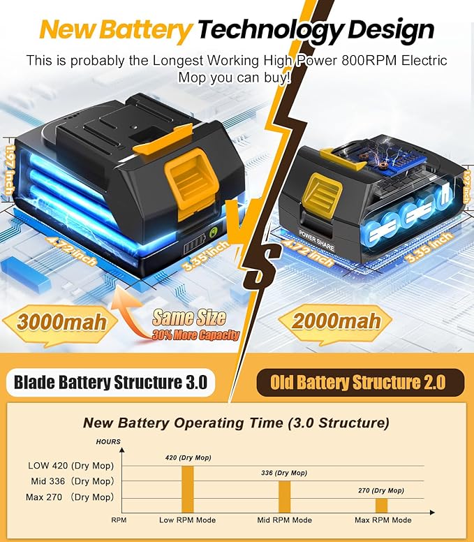 - 【𝐁𝐞𝐬𝐭 𝐂𝐞𝐫𝐭𝐢𝐟𝐢𝐞𝐝+ 𝟔,𝟎𝟎𝟎𝐦𝐀𝐡 𝐋𝐚𝐫𝐠𝐞 𝐁𝐚𝐭𝐭𝐞𝐫𝐲 𝐚𝐧𝐝 𝐜𝐡𝐚𝐫𝐠𝐢𝐧𝐠 𝐭𝐢𝐦𝐞】This is probably the Longest Working 800RPM power mop you can buy! The latest technology 3.0 blade compression construction battery is the same size and has 30% more capacity compared to the old 2.0 construction battery. 2.5 hours to fully charge,two batteries can work continuously for 420 minutes (low speed mode). Enough time to deep clean floors, bathrooms, and everywhere in your house