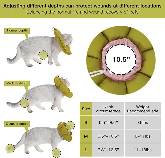 - THE ADJUSTABLE PROTECTIVE RANGE It is designed for pet foot and head wounds, and the depth of the cat cone can be adjusted through the contraction band on the outer ring of the cat cone, Allows pets to eat, drink and exercise normally without interfering with their wound recovery