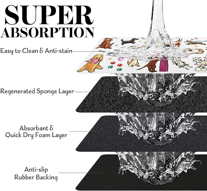 - Super Absorption: The christmas dog mat for water bowl can absorb spilled water without leaving traces and dry quick, avoid wetting pet paws even for messy drinkers. And it does not attract pet hair like traditional silicone dog bowl mat.