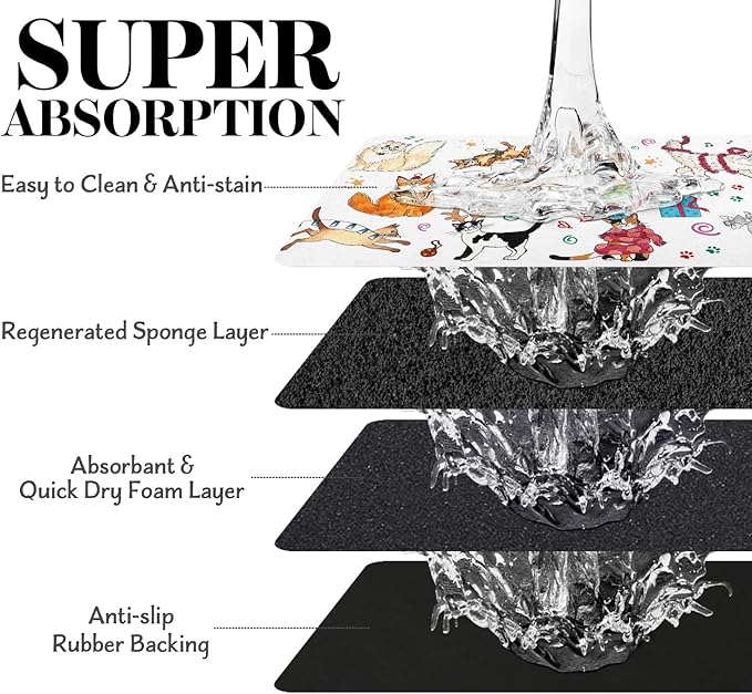 - Super Absorption: The christmas dog mat for water bowl can absorb spilled water without leaving traces and dry quick, avoid wetting pet paws even for messy drinkers. And it does not attract pet hair like traditional silicone dog bowl mat.