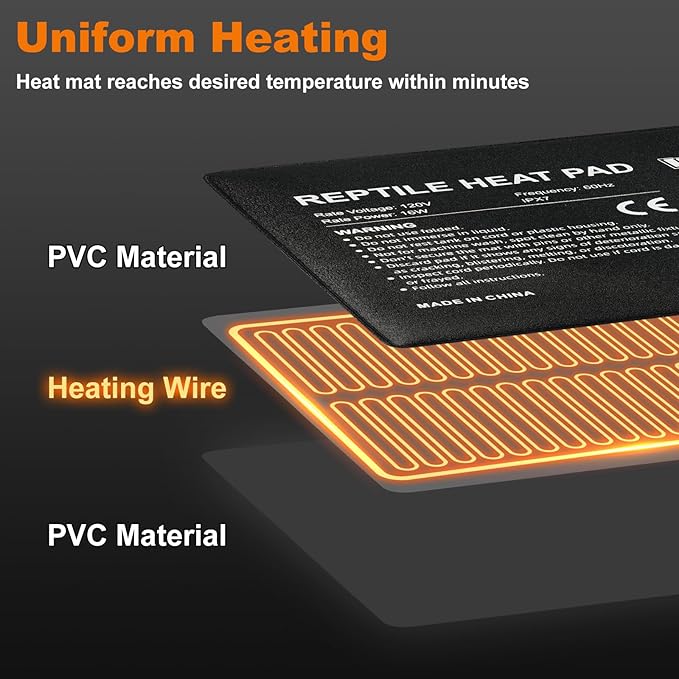 - Waterproof & Durable Material: The reptile heating pad is made from high-quality waterproof PVC material, ensuring quick and even heat distribution, along with long-lasting durability. Its soft surface is flexible and foldable for easy installation and storage. The pad is also easy to clean and boasts excellent abrasion resistance for long-term use.