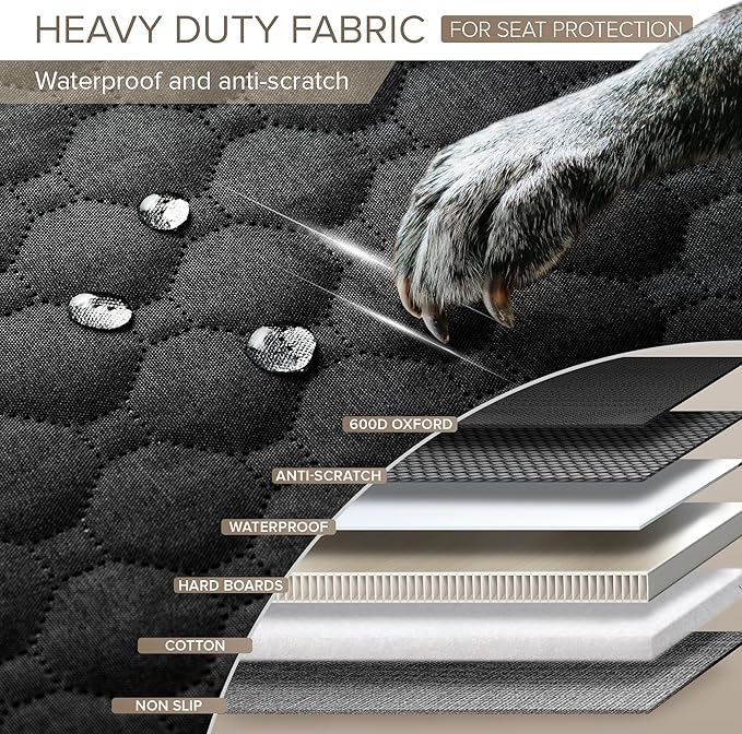 - HEAVY DUTY DOG CAR BED TO ALL-ROUND PROTECTION - The waterproof back seat cover made of 6-layer fabrics, including strong 600D Oxford, dog car seat cover hard bottom and special fabric for scratch-resistant, safeguarding car seats from wear, water and stains. Backseat cover for dogs in car with extra higher door protector avoid doors from scratches and damage. Let dogs hop in and out the dog hammock bed with joy, while car seat covers for dogs takes care of preserving your car perfectly