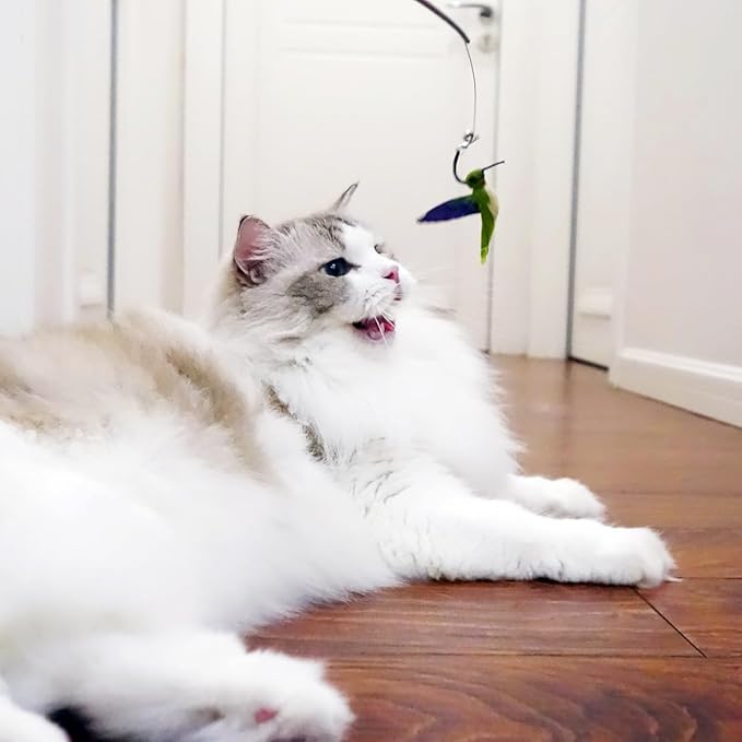 - 【Creative design】The shape of feather toys is Insects and Hummingbird, they make cats full of curiosity. Swing the feather "bait" to get the cat excited, trigger the "hunting instinct", let them run and jump like wild animals, and make your cat go crazy with joy!