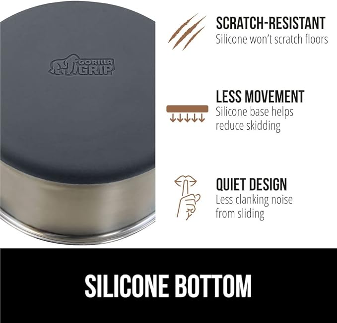- SILICONE BOTTOM: the Gorilla Grip bowl is constructed from durable silicone that helps keep the bowl steady and won’t scratch your floors; while some over eager eaters may still be able to slide the bowls, the silicone will help prevent much movement; plus, it reduces the noise from clanking and sliding across wood, tile, and more
