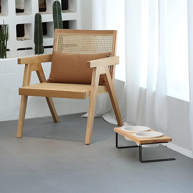 FUKUMARU Elevated Cat Ceramic Bowls, Small Dog Raised Food Feeding Dishes, Solid Wood Water Stand Feeder Set for Cats and Puppy