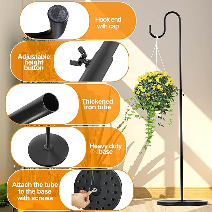 - Versatile Indoor & Outdoor Use – This freestanding plant hanger is perfect for various settings. Ideal for balconies, porches, patios, and indoor spaces like living rooms, hallways, and near windows. It also works well in gardens with paved surfaces and cemetery memorial sites. Designed for hard surfaces, ensuring stability without the need for ground insertion.