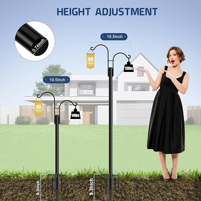 • Versatile & Multi-Purpose: Built with a sturdy frame and double-arm design, our outdoor shepherd's hook is ideal for hanging solar lanterns, flower baskets, plant pots, hummingbird feeders, wind chimes, and more. As shepherds hooks for outdoor, it adds charm and functionality to any outdoor space, making it the perfect accessory for gardens, patios, or backyards.