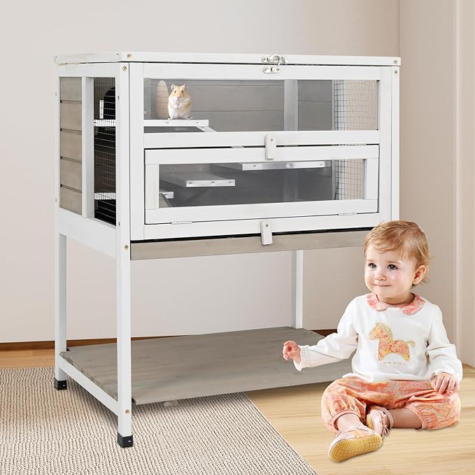 - Elevated 2-Story Guinea Pig Cage with Storage Legs: The first level with play area, allow pet to roam and enjoy itself freely. The second level,integrated storage shelf and stand structure,no need to place the cage on the floor or table,and enough space to put pet's essentials and food, ensuring both convenience and practicality.