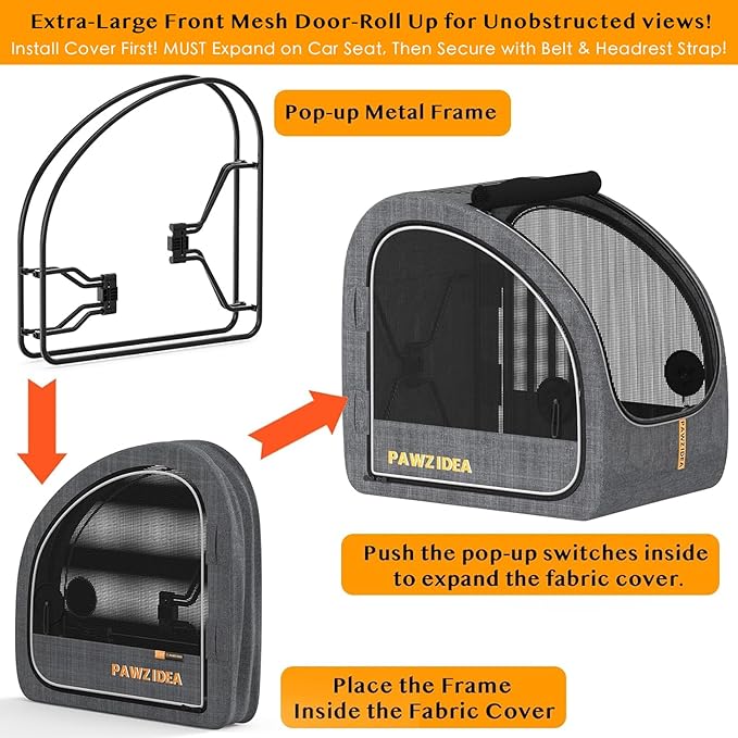 - EASY 4-STEP USE: 1️⃣ Place the machine-washable fabric cover on frame, aligning all 6 side holes. 2️⃣ Fold and expand directly on the car seat for easy entry (fits back seats >19" deep & 28" high seat-to-roof, or front passenger seats). 3️⃣ Secure with seatbelt and headrest straps for safe travel. 4️⃣ Slide the crate into stroller base slots and lock the 2 handle latches to complete setup.