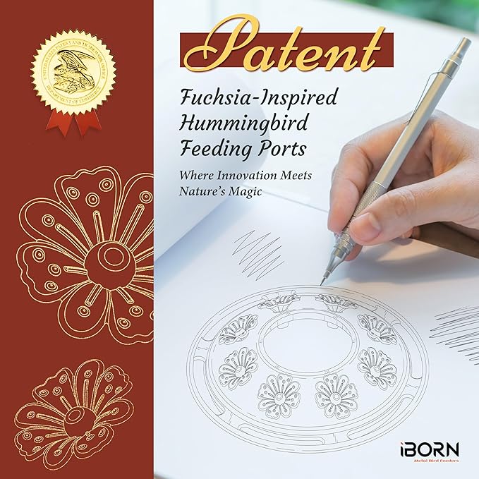 - 【Exquisite Exterior Design,Efficiently Attract Hummingbirds】In 2025 iBorn introduce a new series of hummingbird feeders for outdoors. The product designed a unique honeycomb appearance bottle, the ant moat and feeding ports are designed to reference a favorite flower of hummingbirds, Fuchsias. And the hummingbird feeder is a combination of red and yellow, the two colors that hummingbirds are most sensitive to. Once you hang the bird feeder up, hummingbirds will quickly gather in your yard!