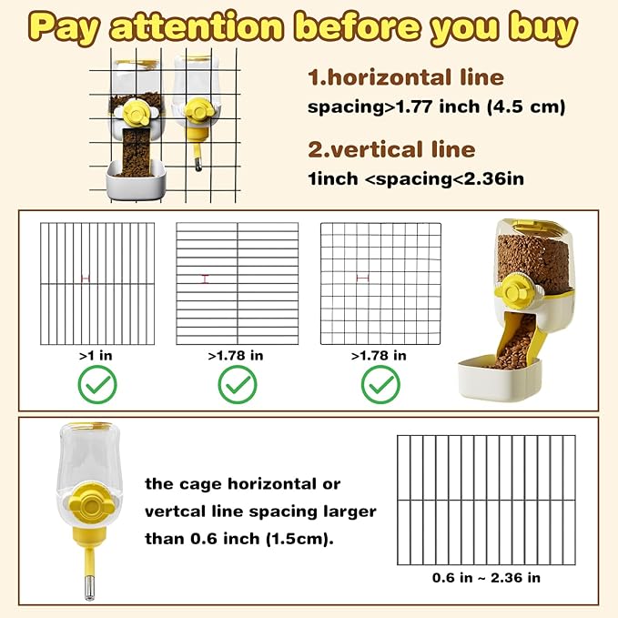 - Tips: the recommended cage net spacing is 2.5-6cm(1-2.36 inch), please measure the cage net spacing carefully before purchase and make sure it can be used, if the spacing is less than 1 inch, you can try to bend the kennel wire bars a little bit