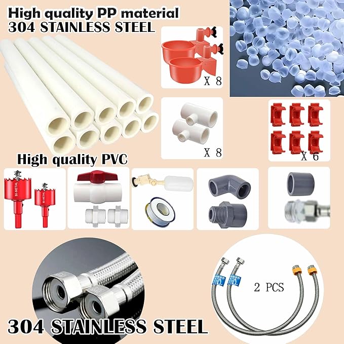 - 【Complete PVC Pipelines Chicken Waterer Set】This is a Complete PVC Pipelines Set with Chicken Water Cups, Automatic Chicken Waterer System.The Chicken Water Feeder system includes Chicken Water Cups, float valves,2 stainless steel hoses. PVC pipe, mounting drill bits, pipe adapters, and all necessary pipe fittings. All you need is an extra bucket and PVC glue to start your DIY Chicken Waterer System