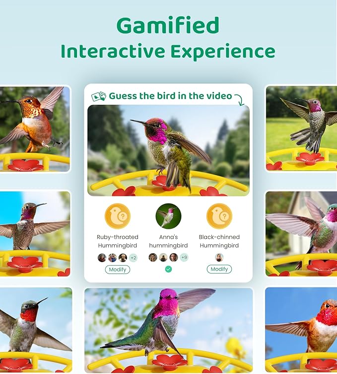 - Smart App & AI Bird ID: The HIXX Smart Hummingbird Feeder with Camera pairs with CoolFly—the first interactive birding app offering free AI recognition, video sharing, and community features. Get instant notifications and recorded clips when a hummingbird visits, and use AI or crowd-sourced help for species identification—making every encounter engaging and connected