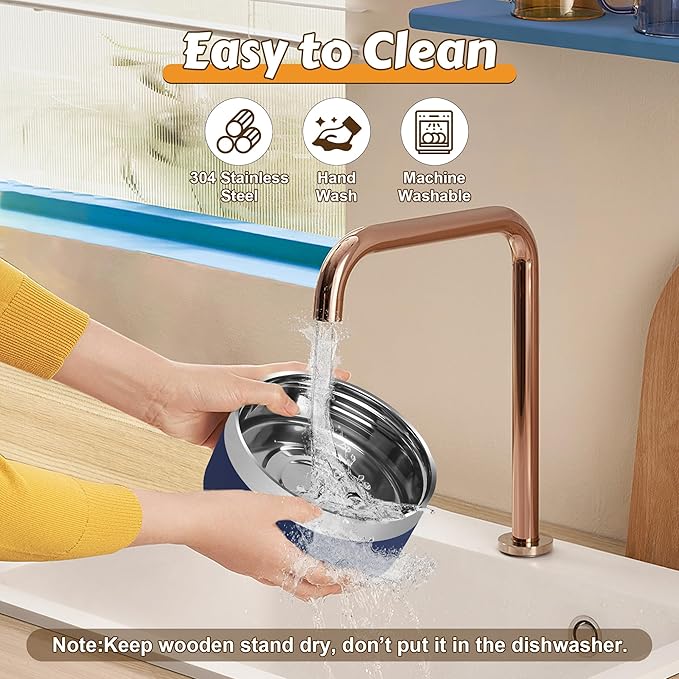 - Easy to Clean: Double stainless steel dog bowls are easy to clean, it is hand washable and dishwasher safe. We recommend wiping the wooden stand with a dry rag after use to keep it looking better prolong its life, place it in a dry environment and avoid water damage