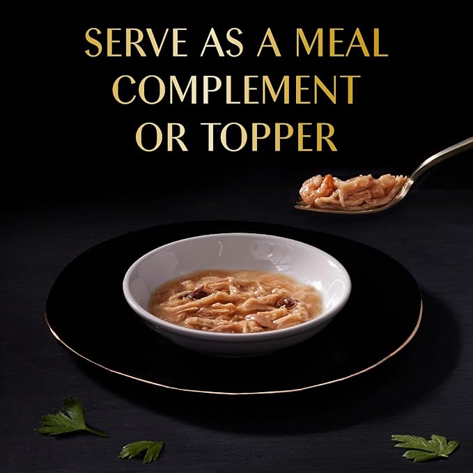 - Gourmet Experience: Your cat will enjoy tender pieces of Chicken and whole shrimp served in a delicate broth over their cat food or as a stand-alone snack