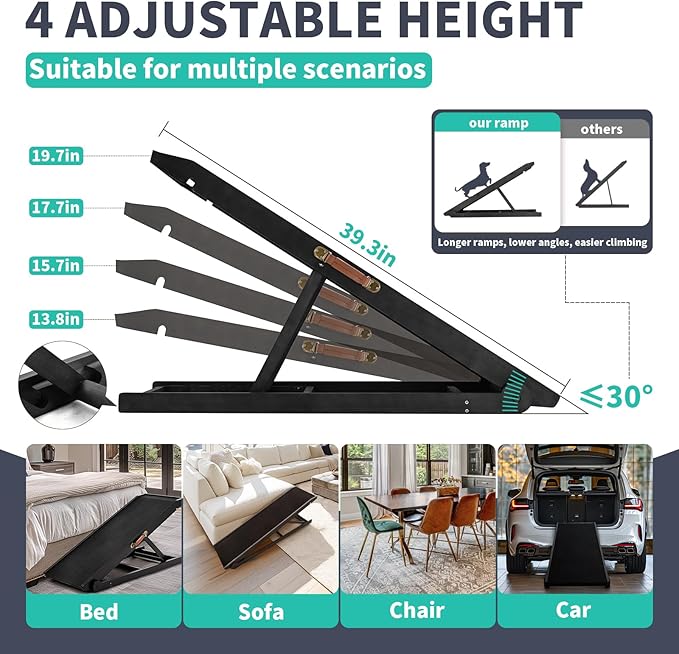 - 4 HEIGHT ADJUSTABLE - Our Pet Ramp can be easily adjusted to 4 heights, you can adjust the appropriate height for your dog ramp according to the height of your bed, sofa and other furniture. Adjustable height to 13.7", 15.7", 17.7'' and 19.6", letting your pet easily go up and down now