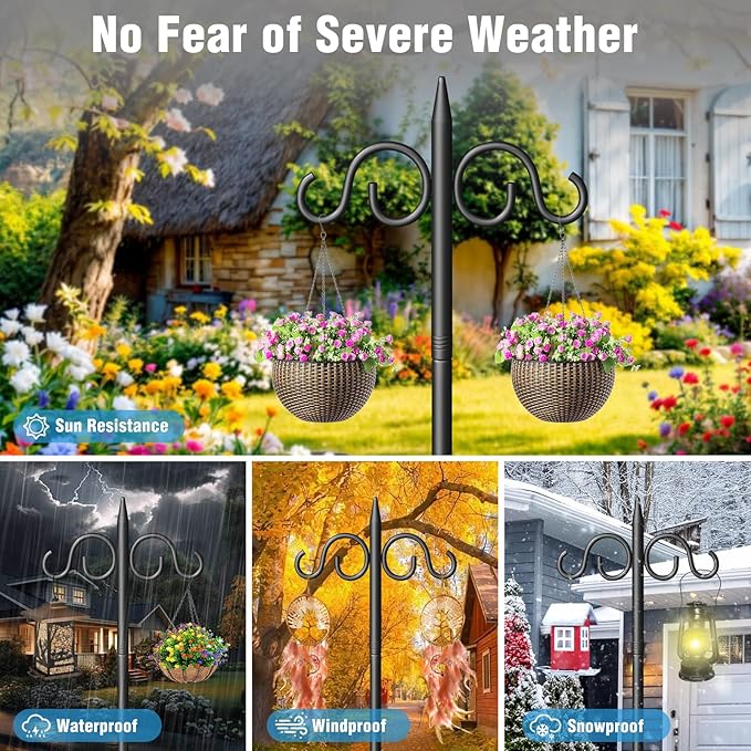 - Double Hook Design: This innovative double shepherd's hook features two hooks, allowing you to hang multiple bird feeders, wind chimes, lanterns, or flower baskets simultaneously. Each hook is reinforced to support heavier items, providing you with a versatile outdoor hanging solution