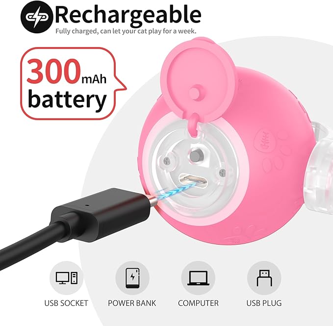 - 【Type-C Charging】The electric ball has a built-in rechargeable battery. Use the mobile phone charger and the Type-C USB cable included in the package to charge the interactive cat toy.