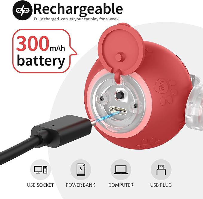 - 【Type-C Charging】The electric ball has a built-in rechargeable battery. Use the mobile phone charger and the Type-C USB cable included in the package to charge the interactive cat toy.