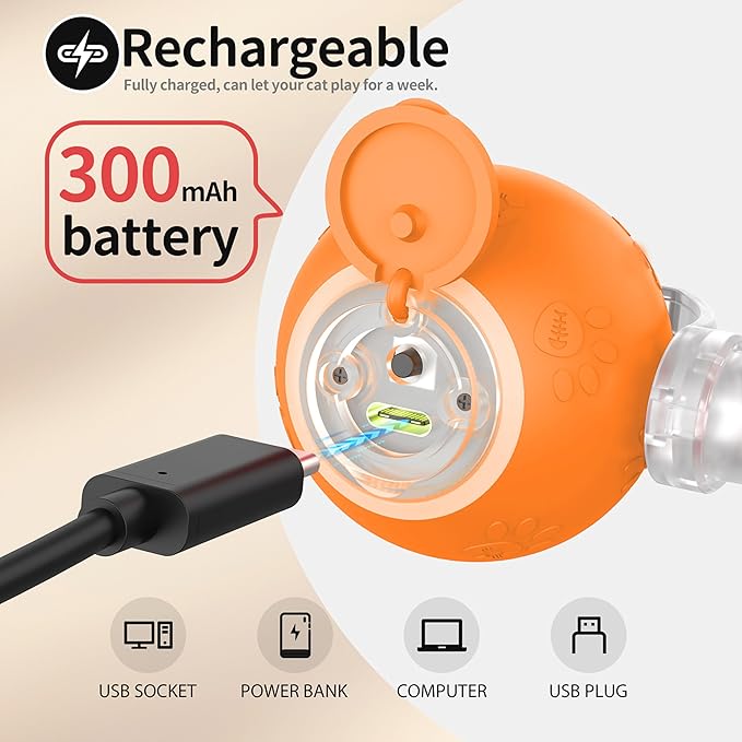 - 【Type-C Charging】The electric ball has a built-in rechargeable battery. Use the mobile phone charger and the Type-C USB cable included in the package to charge the interactive cat toy.
