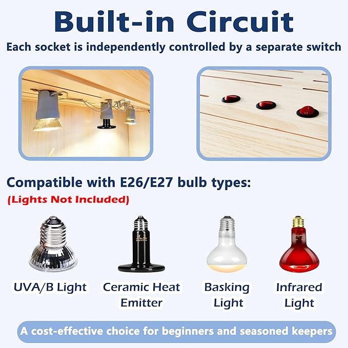 - 【Built-in Bulb Sockets】Featuring two built-in bulb sockets (three in the 40&48-inch version) compatible with E27 heat bulbs, night lights, and more (bulbs not included). Easily set up your lighting for the perfect reptile habitat.