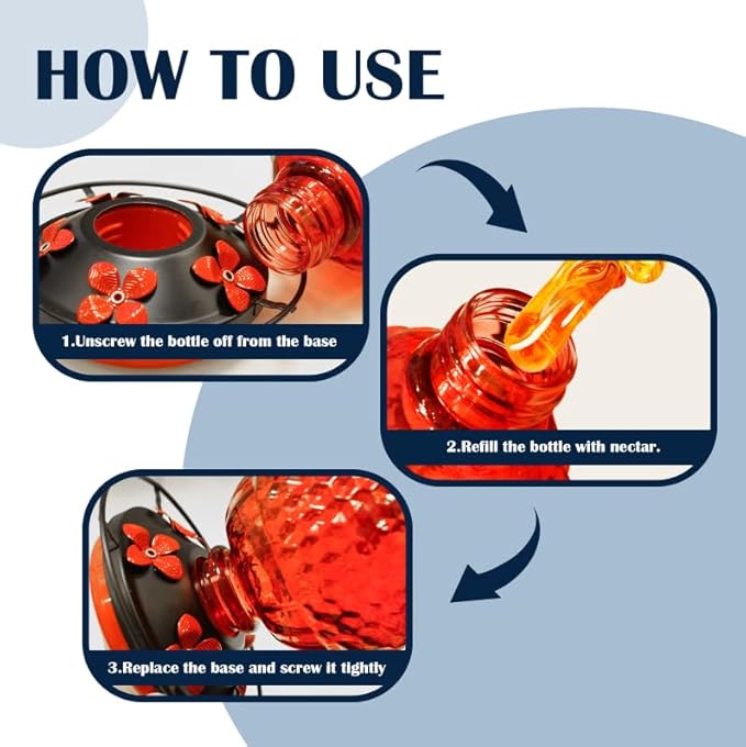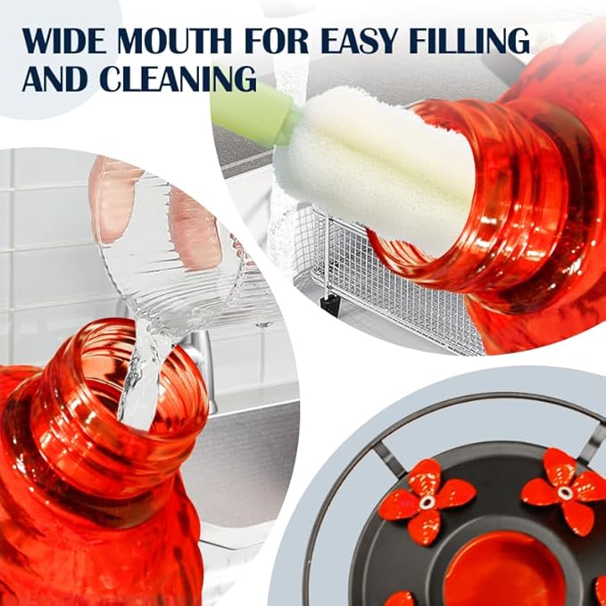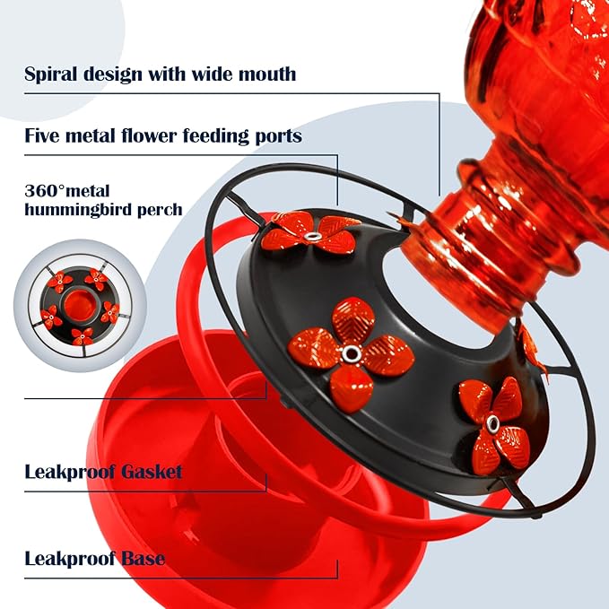 - Easy to clean&refill:Featuring a wide-mouth bottle design,simply screw the container off the rust-resistant metal base for cleaning or refilling,then just tighten the water or nectar-filled container to the base,hang it from trees,shepherd's hooks,hooks.Since there is a piece of durable rubber gasket around the base, fully guarantees its sealing,you don't have to worry about leaking at all.