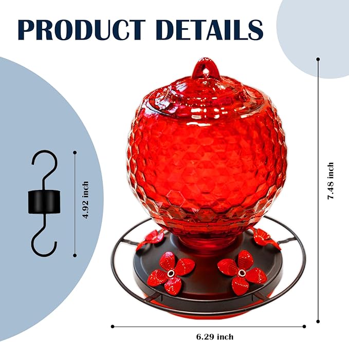 - Perfect Gifts for Friends and Family:This eye-catching elegant glass hummingbird feeder outdoors is a perfect garden decor gifts for wife,daughters,sisters,aunts,grandparents,or friends on Birthday,Thanksgiving,Christmas,Mother's Day,anniversaries,Christmas and so on.With its exquisite craftsmanship,it can be a perfect decoration for garden,outdoors,yard,patio,backyard,front porches,outside, etc.