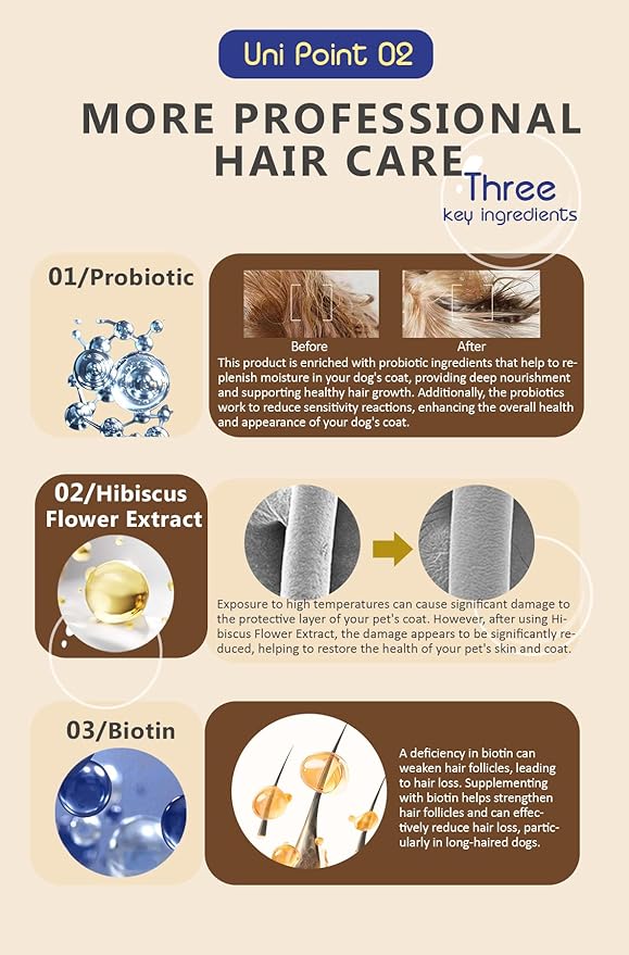 - ✨ Say Goodbye to Post-Bath Chaos -- No more mats, breakage, or frizz. Biotin, coconut oil, and hibiscus work together to smooth the coat and strengthen strands, reducing shedding and tangling stress.