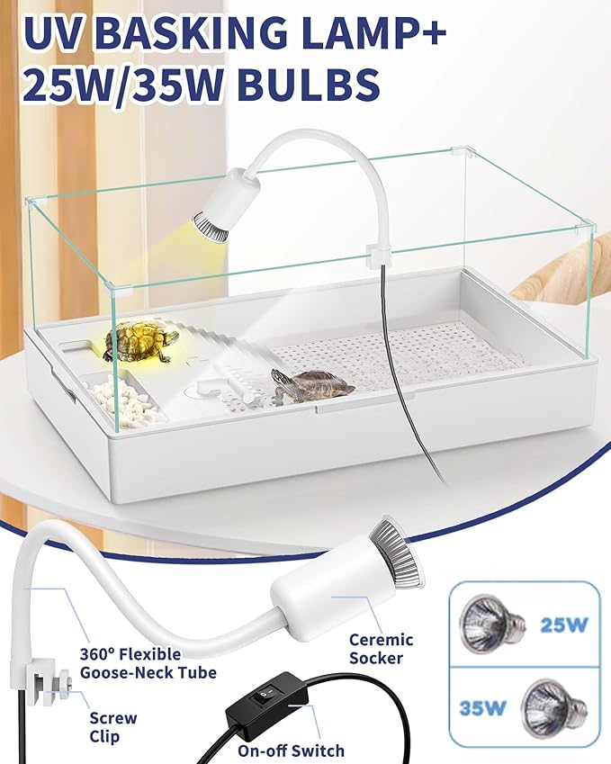 - 【360° Rotated Lamp with 25W & 35W Bulbs】 Our turtle habitat kit providing your pet a healthy environment, turtles need light and heat to thrive indoors. The light has UVA/UVB light that simulate sunlight, UVA can promote appetite, and UVB can promote calcium absorption by reptiles. Our reptile lamp fixture can be rotated 360° in any direction, tightly clipped on edge of tank's acrylic fences, the basking bulb provides the light turtles need.