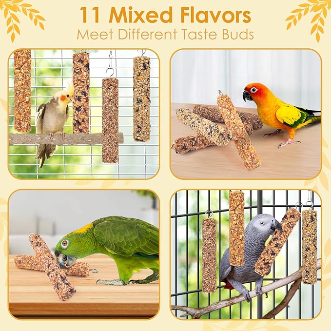 - VARIOUS CONURE SNACKS: There are 4 crunch sticks, mixed multiple flavors for your birds to choose. Satisfy different tastes and provide high-energy replenishment, which can help birds flourish while enjoying the freshest quality treats