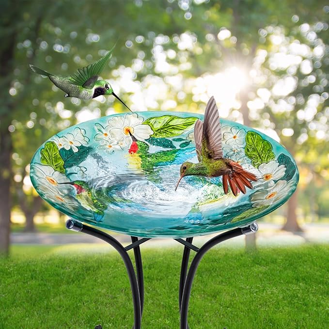 - {Easy to place and clean} The folding bracket of the outdoor glass bird bath is designed to be easily stored and moved, and can be placed anywhere you want. The high quality coating on the glass surface allows you to easily remove bird droppings or dirt