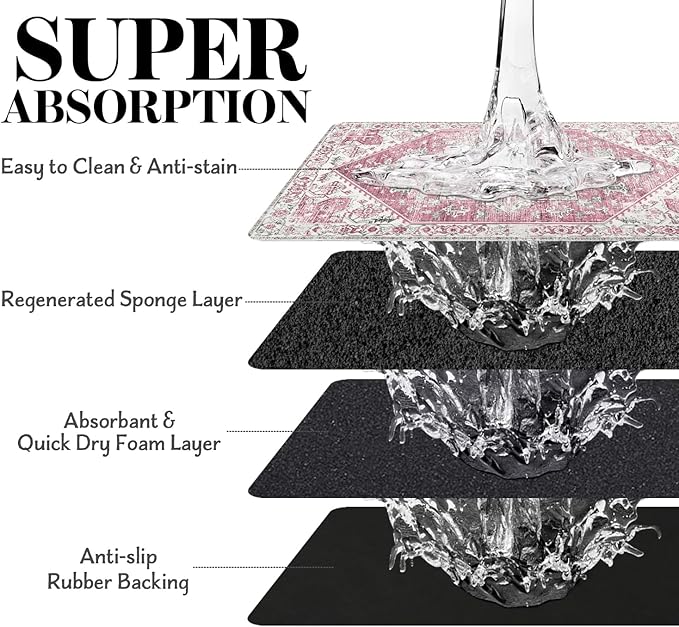 - Super Absorption: The dog mat for water bowl can absorb spilled water without leaving traces and dry quick, avoid wetting pet paws even for messy drinkers. And it does not attract pet hair like traditional silicone dog bowl mat.