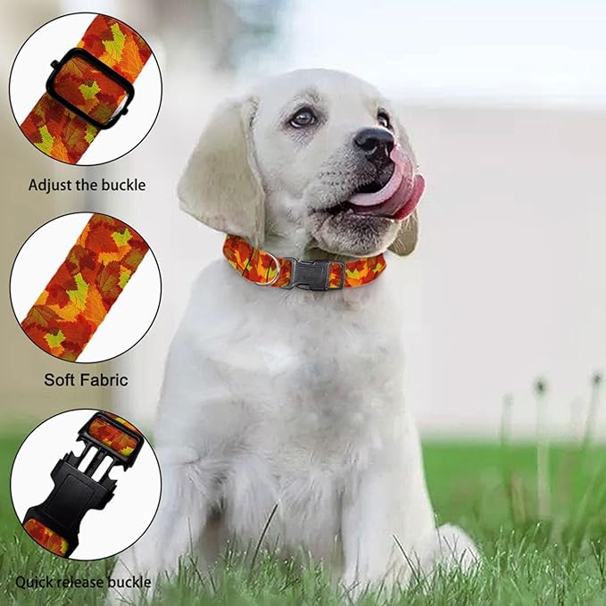 - 2. Material: This Fall Red Orange Maple Leaf Autumn dog collars is made of soft, comfortable and elastic polyester fabric, our pet collar strap is designed to be both anti-slip and wear-resistant, ensuring long-lasting use while keeping your furry friend cozy.
