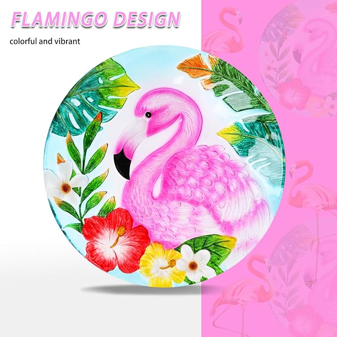 - {Pink Flamingo Birdbath} Uses special substantial nontoxic glass, causes zero harm to birds and other creatures, and this glass bird baths for outdoor has lovely flamingo as well as distinctively bright-colored which would attract more birds to bathe
